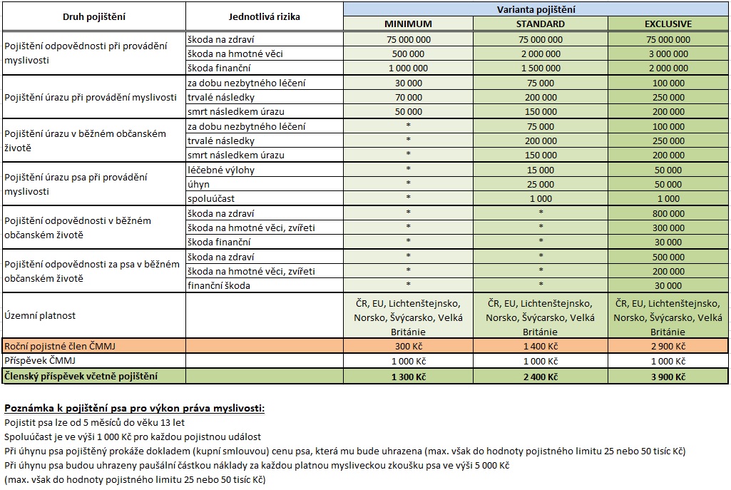 Každý člen ČMMJ je pojištěn proti následkům povinné odpovědnosti za škody dle zákona o myslivosti a pro případ úrazu utrpěného v souvislosti s prováděním myslivosti na základě hromadné smlouvy sjednané ČMMJ s Všeobecnou pojišťovnou Halali, a.s. Nižší členský příspěvek platí plně invalidní důchodci, důchodci starší 65 let, studující v denním studiu do věku 26 let a žáci do věku 18 let. Nižší členský příspěvek mohou platit také členové lesníci a myslivci z povolání, kteří prokáží, že povinné pojištění jim hradí jejich zaměstnavatel na základě hromadné pojistné smlouvy sjednané s pojišťovnou.